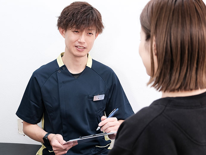 当店は不調を繰り返さない(根本改善)を目標にしています。なぜ痛みが出ているのか、どのような生活・日常動作に要因があるのかを探るため、初回の問診を含め、都度状態をお聞きし各々にあったメニューを提案させて頂きます。そのうえ、来店後の生活アドバイスなどをさせて頂きお客様と二人三脚で不調改善を目指していきます。私自身も以前営業をしていたことがあり、首・肩こり・頭痛といった不調に悩まされていました。